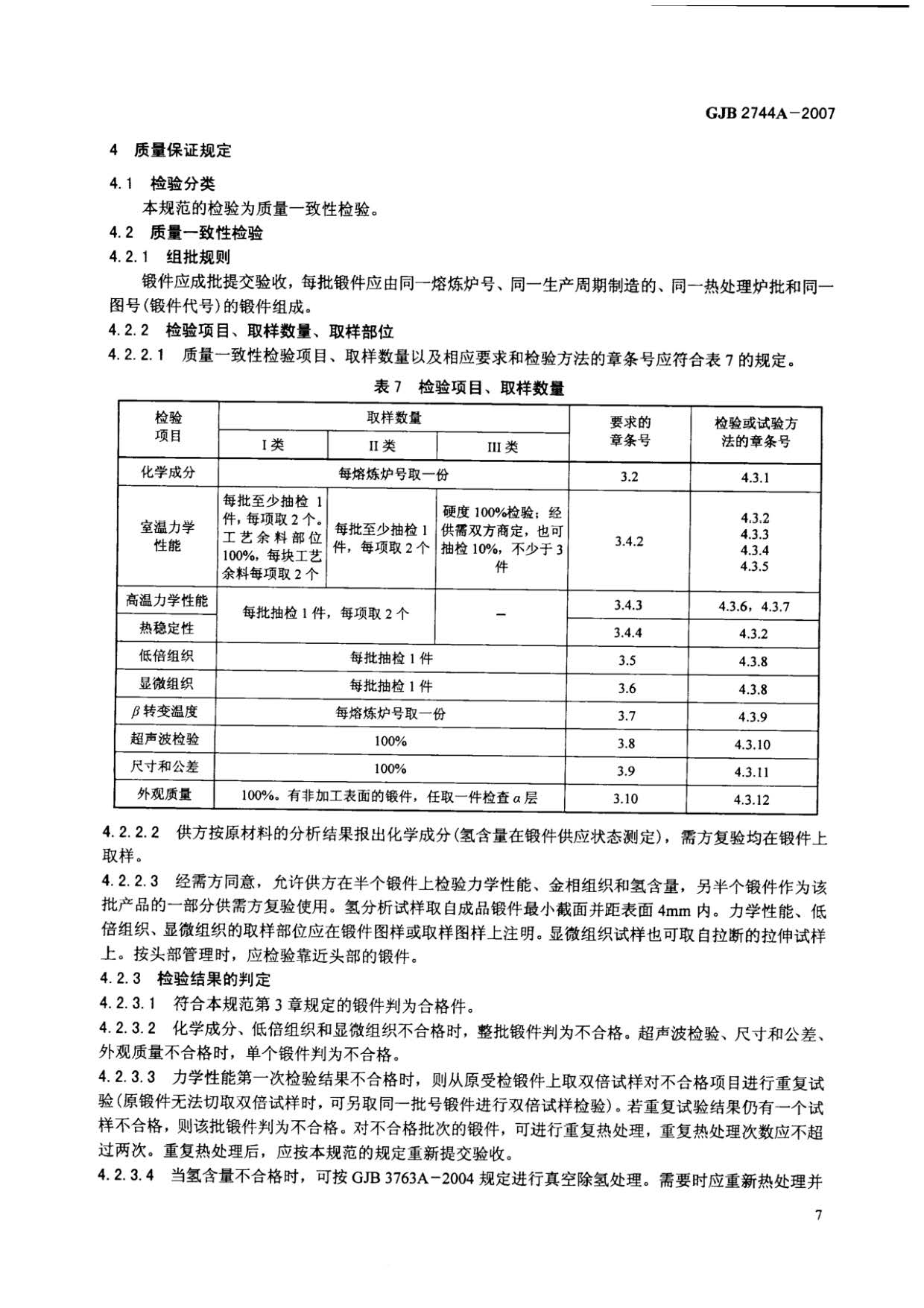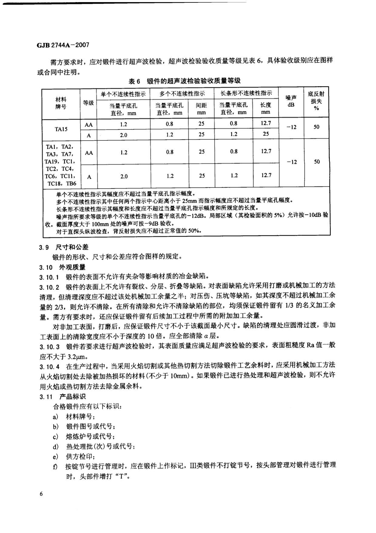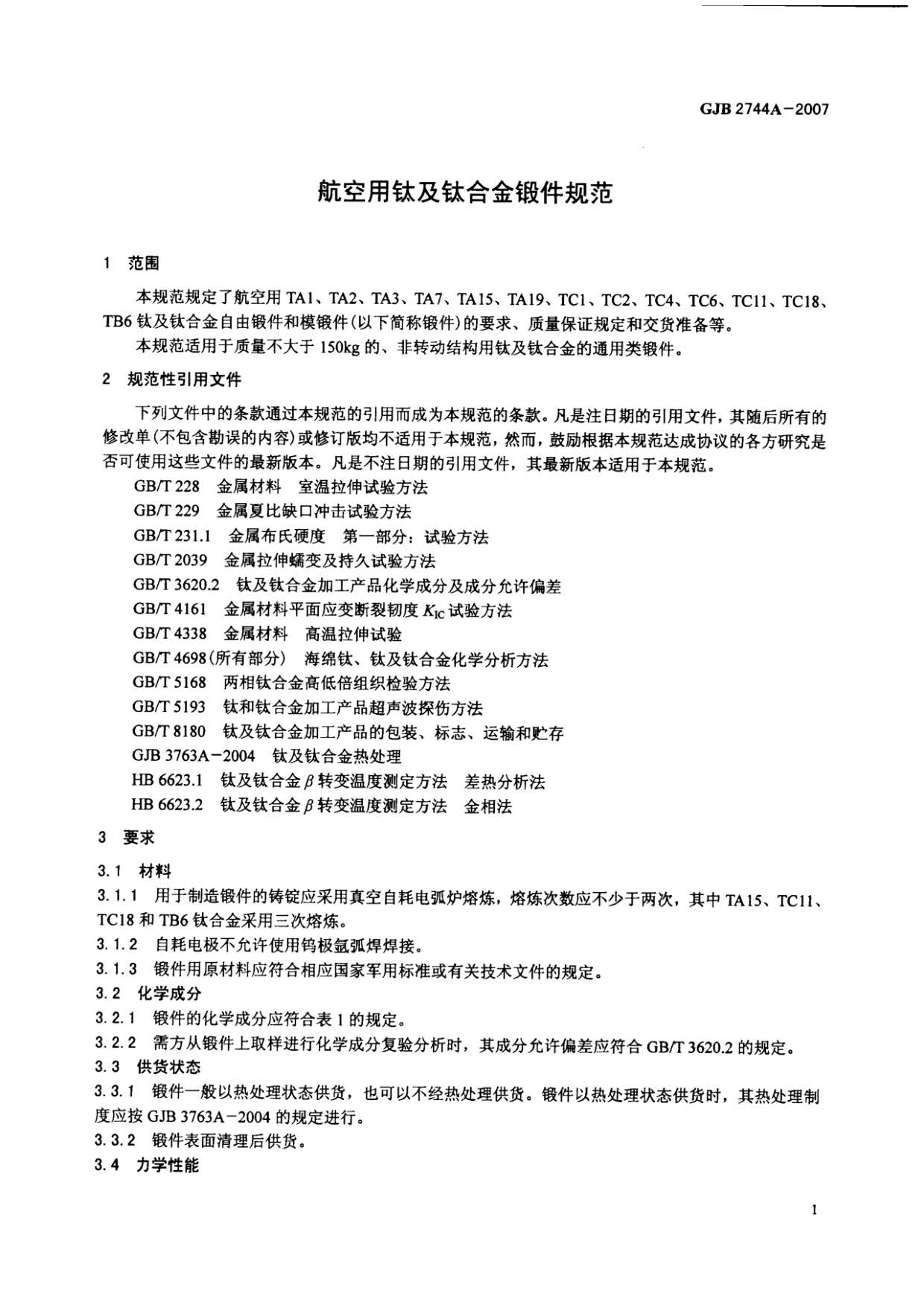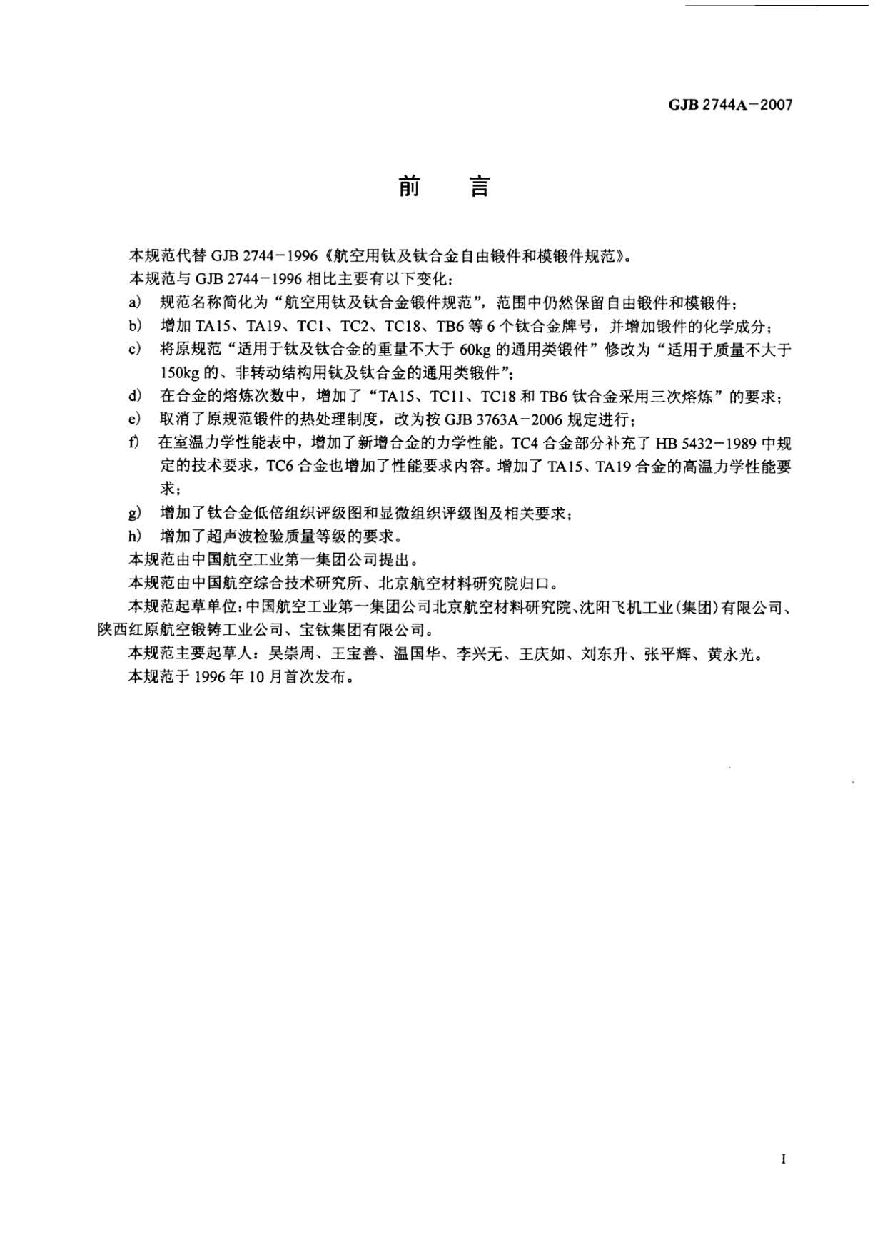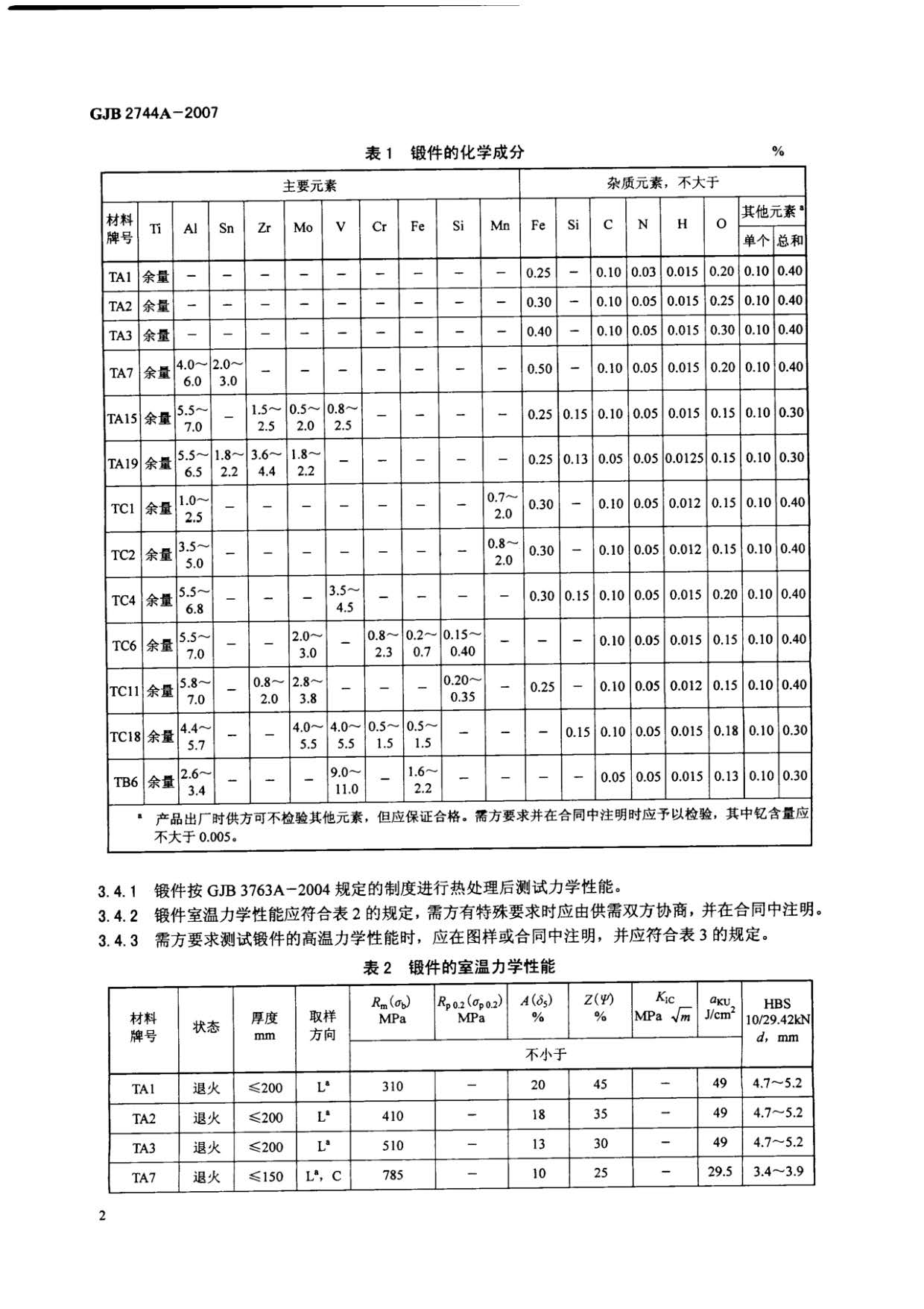 航空用鈦及鈦合金鍛件規(guī)范 GJB 2744A-2007,規(guī)定了TA1、TA2、TA3、TA7、TA15、TA19、TC1、TC2、TC4、TC6、TC11、TC18、TB6鈦及鈦合金自由鍛件和模鍛件(以下簡稱鍛件)的要求,質量保證規(guī)定和交貨準備等。